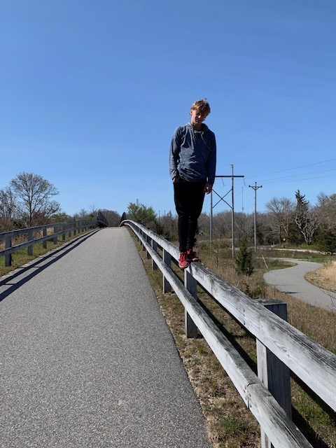 When we finally arrive at the Cape Cod Rail Trail, Oakley takes off like a rocket, as I knew he would. His legs power up and down, and he quickly outdistances me. A flock of wild turkeys has congregated on the path. The males have their tales fanned, out and the females are coquettishly prancing around them. Again, Oakley must screech to a halt. “Look at the turkeys,” he calls. I zoom up behind him. As I do, a rabbit is flushed out from the bushes and joins the turkeys. It freezes long enough for us to marvel at its huge, white fluffy tail and twitchy whiskers. “He is so cute!” Oakley has obviously forgotten how much he hates biking. “This is awesome! I am going to see how many miles I can go no-handed.” He is off again. The dark fury inside him has been extinguished as he moves through the outdoors burning his energy and feeling amazed by what he encounters. He cycles one and one-half miles no-handed with panache.