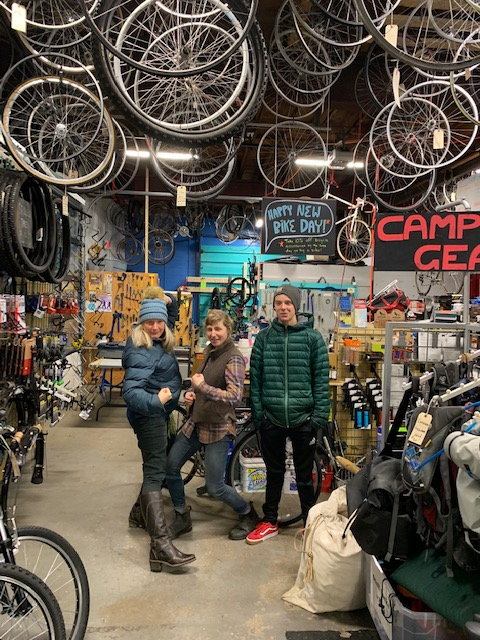 Oakley and I are ready. First, Ainsley, the manager, sizes up Oaks and me. She has us survey the shop floor: what shaped handlebars do we want? What kind of seats? What are the pros and cons of click shifters or thumb shifters or twist shifters? Our minds whirr. So many choices. “Would you like to look in our shipping container out back? We have lots of options.” She says. Would we? You bet!